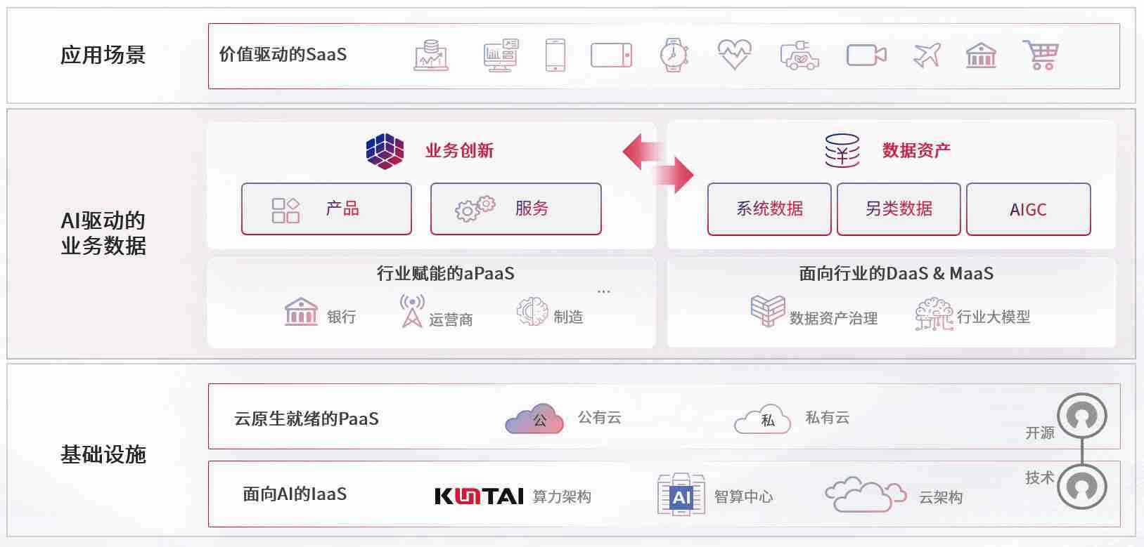 数字时代,,围绕企业数字化转型的关键要素,,,EBPAY钱包数码开创性的提出数云融合战略和技术体系框架,,着力在云原生、、、、数字原生、、、AI原生和信创产业上架构产品和服务能力,,,,为处在不同数字化转型阶段的快消零售、、、汽车、、、、金融、、、、医疗、、政企、、教育、、运营商等行业客户提供泛在的敏捷IT能力和融合的数据驱动能力,,,构建跨界融合创新的数字业务场景和新业务模式,,助力企业级客户建立面向未来的核心能力和竞争优势,,,全面推动社会的数字化、、、智能化转型升级。。。